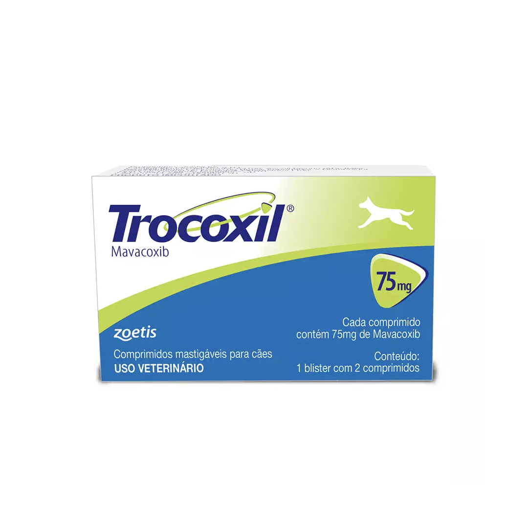 Trocoxil é um anti-inflamatório não-esteroidal usado para tratar dor e inflamação. É indicado no tratamento de dor e inflamação associados à doença articular degenerativa em cães, quando necessário tratamento por mais de um mês. Fórmula: Cada 100mg contém: Mavacoxib - 5mg Excipientes - 100mg