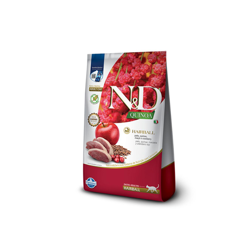 RAÇÃO FARMINA PARA GATOS ADULTOS ND QUINOA HAIRBALL PARA GATOS ADULTOS SABOR PATO, QUINOA, MAÇA E CRANBERRY 1,5KG