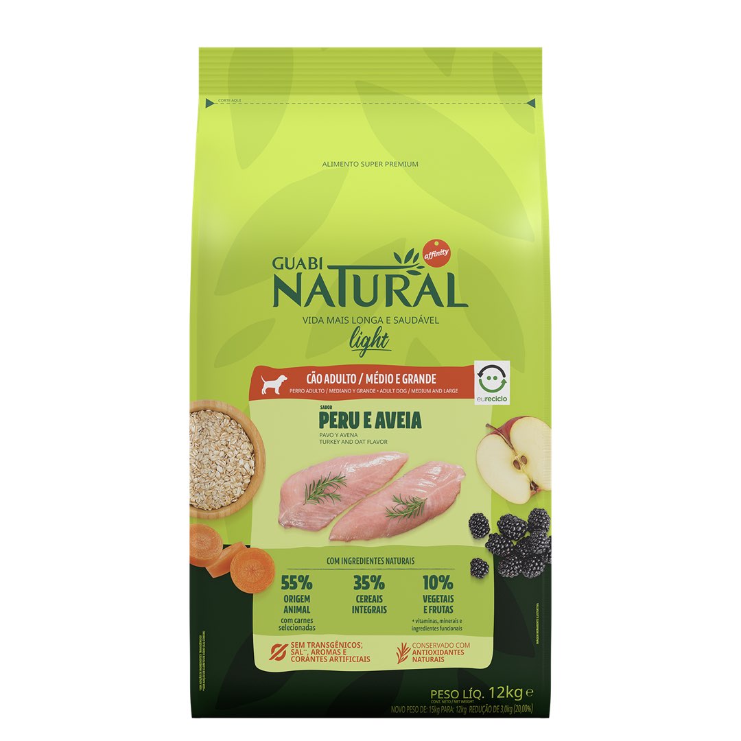 RAÇÃO GUABI NATURAL CÃO ADULTO LIGHT MÉDIO E GRANDE PERU E AVEIA 12KG